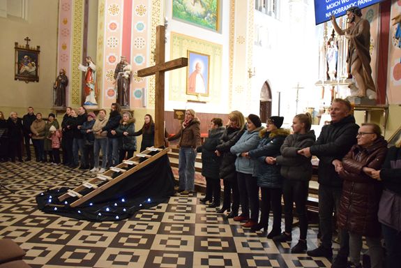 Krzyż pomiędzy poszczególnymi stacjami nieśli przestawiciele różnych stanów i członkowie wspólnot działających w parafii.